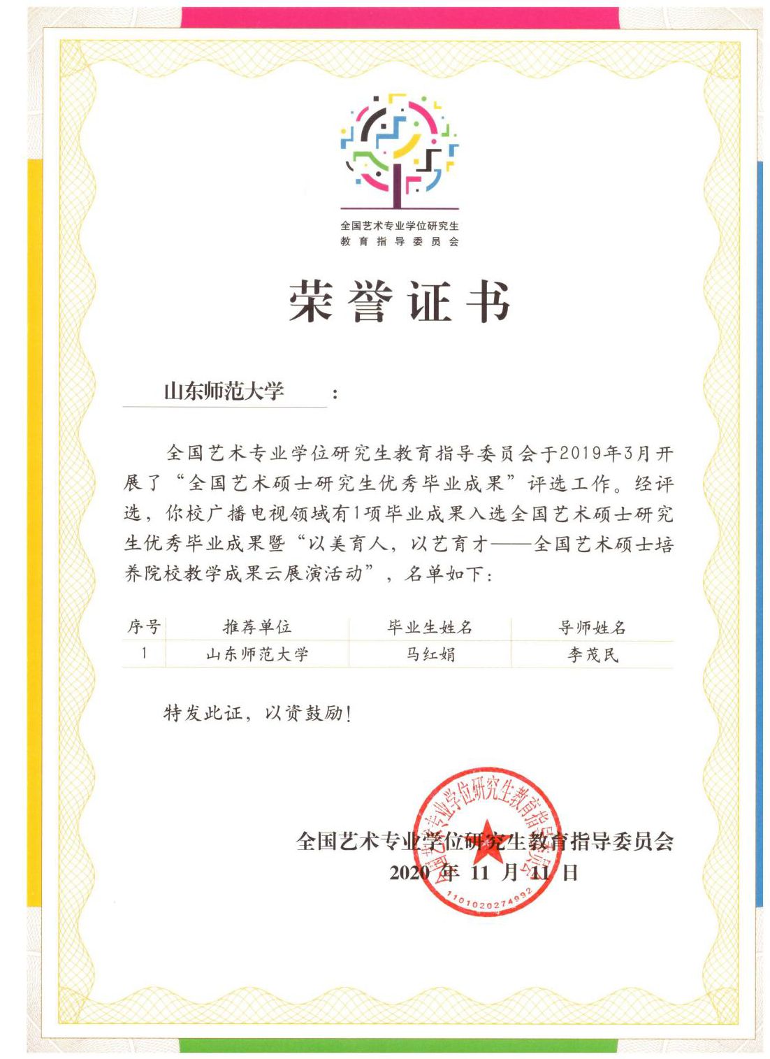 近日,全国艺术专业学位研究生教育指导委员会公布了“全国艺术硕士研究生优秀毕业成果”暨“以美育人,以艺育才——全国艺术硕士培养院校教学成果云展演活动”评选结果,英国上市公司3652017届毕业生马红娟的硕士毕业作品入选。