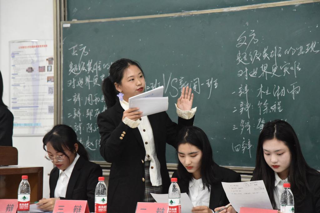 新生辩论赛决赛的辩题为“超级英雄的出现对世界更幸福还是更灾难”,正方是2020级新闻二班,他们持“超级英雄的出现对世界更幸福”的观点,反方是2020级新闻一班,他们的观点是“超级英雄的出现对世界更灾难”。正方四位辩手是2020级新闻二班的周雨婷、郑历惠、赵佳莹和替补选手2020级戏影一班的陈诗雨,反方四位辩手是2020级新闻一班的杜湘雨、徐程、肇梓茗、孙智蒲。双方辩手进行了简单自我介绍后,比赛正式开始。正方一辩从物质和精神两个方面分别说明了超级英雄对世界的正向价值,反方一辩则指出超级英雄在施展能力帮助人类时可能会对人类文明造成不可避免的破坏,从而引起人对自身价值的怀疑,两位辩手面对质询均做出了坚定充分的回答。在双方辩手互相质询和总结后,短兵相接的对辩过程更是针尖对麦芒,双方各展其长,唇枪舌战又不失风度,为我们带来了精彩的视听盛宴。其中,反方四辩孙智蒲的陈词聚焦发展人的价值问题,认为人不应该从超级英雄身上寻找救赎而是应该自我救赎,该观点得到现场观众的热烈掌声。在双方分别总结后,评委上台述票,就双方辩题提出自己的看法并给予双方辩手一定的辩论技巧建议。