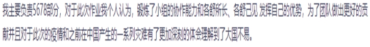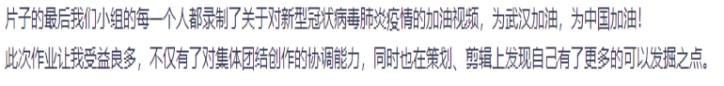课程融入“思政课程、课程思政”理念,新冠疫情背景下的线上教学,作为大学生面对国难当头、全民参战的社会现状,思想上、情绪上都需要引导和输出。很多同学在课堂上吐槽宅在家里的生活,也有同学用艺术创作的形式、参与社会志愿服务的形式来关注社会和民生。针对这一情况,结合课程章节内容“影视音乐的历史”,我给学生布置了上文提到的作业2,以“中国影视歌曲·为战‘疫’胜利加油”为主题,以小组为单位进行视频节目编创,形成有画面、音乐、解说的视频短片。这是一项高难度、大容量的作业,需要同学们相互配合、团队协作,更需要用深切的情怀、艺术的手法创造性完成。学生以饱满的热情积极参与到创作中去,在一周之内基本完成创作,既拓宽课堂内容的宽度和深度,学生们也通过深度交流和团结协作得到了锻炼和提升,目前学生创作的视频作业已经在学院公众号发布,受到社会关注和师生好评。
