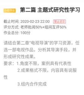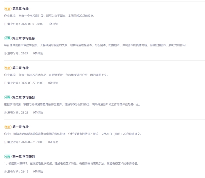根据《电视导演》课程授课模式的要求,“智慧树”网络教学平台工具丰富,能够简单、便捷、有效地完成教学资源共享、学习任务布置、作业提交批阅、线上问答交流和小组研究教学等环节的功能,便于实现网络教学的通畅性、共享性和互动性。