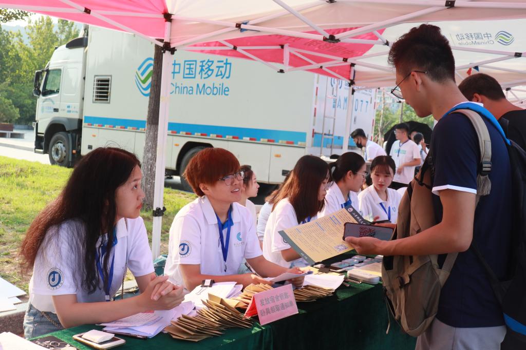 在迎新现场,学院特色迎新亮点突出,新生可领取“新传欢迎你”系列手幅纪念品,留下入学专属纪念。在“心愿·诺”专区,学院提供了便利贴和心愿瓶,供新生书写大学寄语、规划和愿望,收集好保存至大四,为毕业季活动做准备。此外,结合学院专业特色,用Vlog的形式对迎新工作、新生采访、家长采访进行拍摄,作为年级转段、毕业纪念的重要影像素材。今年暑期,学院征集了“新生,为自己加油”主题照片组成照片墙,设置为“最好的我·我们留影”专区供新生和家长合影留念。为提高新生安全意识,学院专门设置了防诈骗警示处,对新生进行防诈骗、防推销等安全知识教育,防患于未然。
