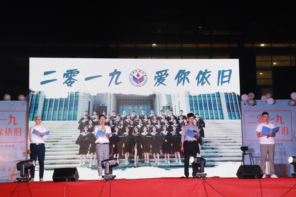 毕业晚会以“2019·爱你依旧”为主题,分为“始于缘”、“疲于战”、“凝于志”、“终于梦”四个篇章进行。伴随着2019届播音专业毕业MV《追梦赤子心》的放映,晚会正式拉开序幕。一首改编歌曲《晚会欢迎你》,用歌唱的形式将49位毕业生的姓名深情演绎,瞬间调动了观众们的情绪。由播音主持系教师蒋博文与毕业生陈明带来的表演,将浓浓的《师生情》展现的淋漓尽致、声入人心。孙鸿菲、李轩等人为大家呈现了一场配音秀的视听盛宴,撼动心扉,充分展现了他们四年来练就的优异的专业素养。在歌曲《光阴的故事》的旋律中,晚会落下帷幕,2019届播音与主持艺术专业毕业生们纷纷登台,以最后一次报学号的方式,用真诚的话语,充分地表达着自己对学校、老师和同学们深深的眷恋。学院领导、老师们也上台为毕业生们送上真挚的祝福,祝愿他们在未来的日子里不忘初心,砥砺前行。