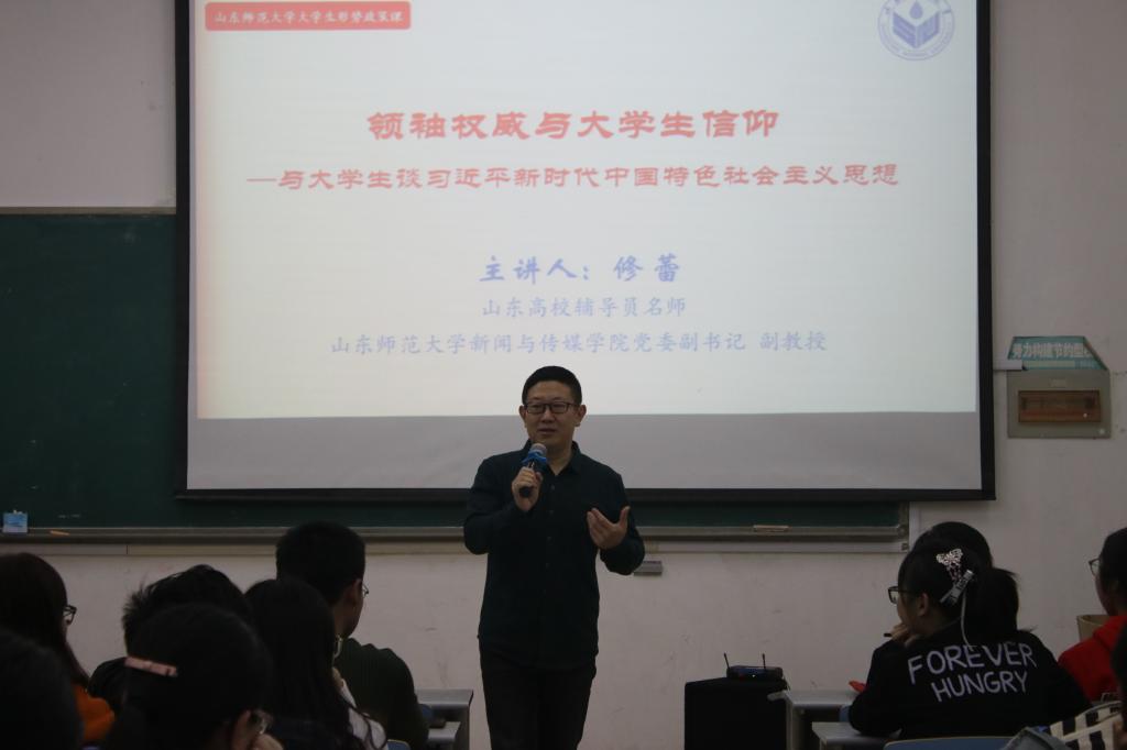 围绕“领袖权威与大学生信仰”这一主题,修蕾从“党的核心和人民领袖的标准、人民领袖的典型人物、十八大以来习近平总书记的作为、领袖权威与大学生信仰”四个方面展开讲授。他以“当下时代是什么样的时代”为切入点,一开始就以交流互动的新颖形式,与大学生畅谈新时代的诸多特征,把同学们听课的注意力和兴趣吸引和调动起来。修蕾指出,新时代最卓著的理论成果和治国治党方略就是习近平新时代中国特色社会主义思想。他通过历史唯物主义的视角,分析了“领袖在社会历史进程中的地位与作用,解读了毛泽东、邓小平、习近平三代领袖带领中国人民实现“站起来、富起来、强起来的”伟大功绩,特别是十八大以来,在以习近平同志为核心的党中央坚强领导下,中国所取得的“历史性变革”和“解决了许多长期想解决而没有解决的难题,办成了许多过去想办而没有办成的大事”的辉煌成就。修蕾讲到,习近平总书记身上所体现出的“政治信仰坚定、人民情怀笃厚、思想理论卓然、治国治党有力、人格魅力深沉”,非常值得大学生“用心、用力、用脑、用情、用行”拥戴、学习和追随。