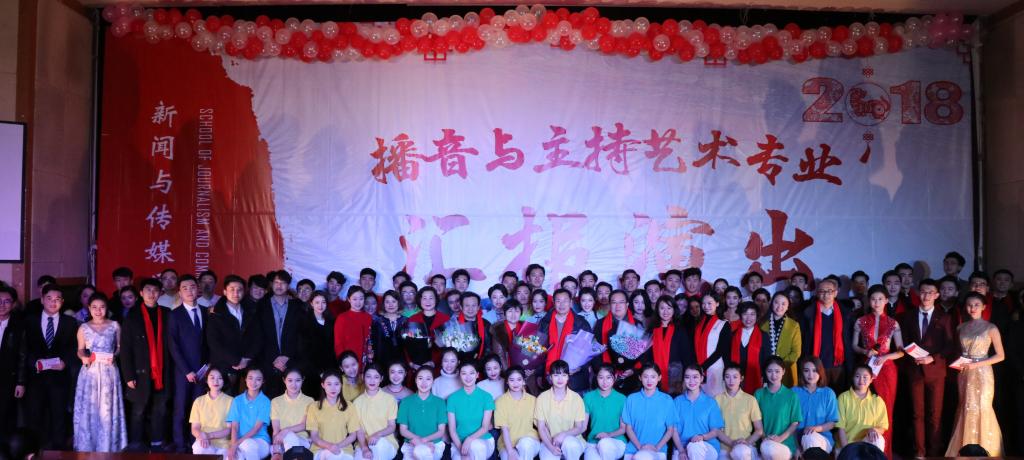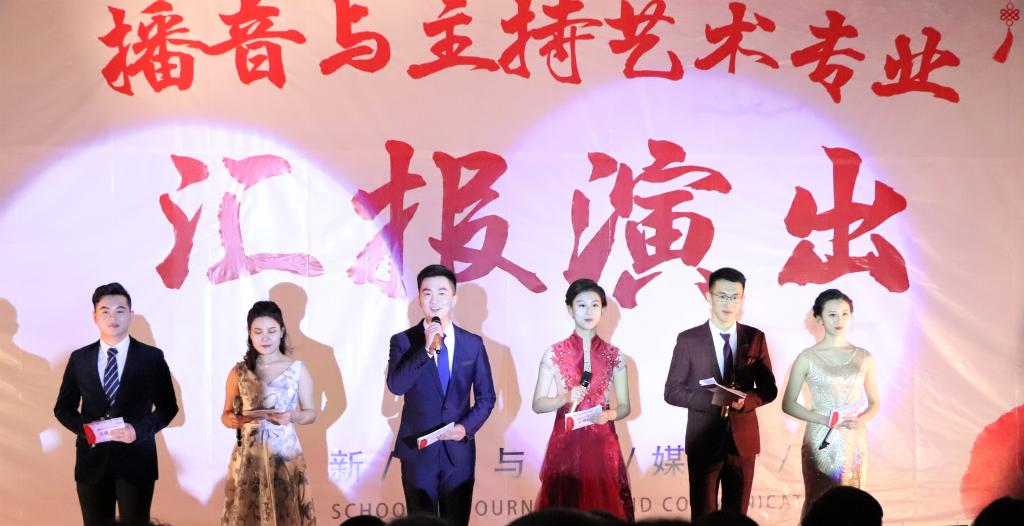 播音与主持艺术专业汇报是播音主持系一年一度的专业技能测试的一次集中展示。今年的汇报演出的14个节目分别由播音主持系的刘静敏教授等九位教师负责指导、训练,2015、2016、2017等三个年级的全体同学登台展示。整个演出安排合理,结构严谨,精彩纷呈,富有创意。其中李轩等六位男生带来的小合诵《农历,汉字的祖国》第一个上场,他们的精彩演绎瞬间将受众带入了汉语的美妙意境中;李静等人的诗朗诵《就是那一只蟋蟀》细腻动人,画面唯美,不仅带领人们再次聆听经典,还深情地缅怀了刚刚逝去的著名作家余光中先生;尹相龙同学的独诵 《血的再版——悼亡母诗》(节选)是第19届齐越朗诵艺术节暨全国大学生朗诵大会的获奖作品,他的深情而充满魅力的朗诵功力深厚,催人泪下,将汇报演出推向了高潮。最后,2017级全体同学满怀激情地朗诵了著名诗人杨牧的《我是青年》,为汇报演出画上了圆满句号。