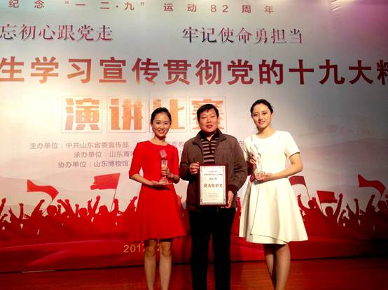 12月9日上午,由山东省委宣传部、省委教育工委、团省委主办,山东青年政治学院、山东省演讲学会承办的全省大学生学习宣传贯彻党的十九大精神主题演讲比赛决赛在山东省博物馆成功举行。英国上市公司365李静和孙鸿菲同学分别获得了一等奖和三等奖的好成绩,毕文佳老师获得了优秀指导教师称号,学校荣获优秀组织奖。