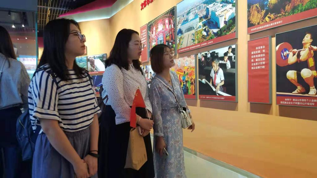 成就展分为主题大厅、奋进的山东、美好生活·未来已来三大展区,以600余张典型图片、10部视频、百余组具有代表性的实物和文件资料、360度沉浸式大型环幕等展项全方位地介绍了建国70周年以来齐鲁大地的栉风沐雨、乘风破浪和春华秋实,展示了齐鲁儿女在波澜壮阔的社会主义革命和建设中创造的翻天覆地的巨大成就,突出了“奋进”这一主题。早上9点入馆,大家就被主题展厅大气恢弘的红色国庆主题氛围所感染了,看照片、读说明、听讲解,在时代楷模英模、弘扬“沂蒙精神”等展板前大家纷纷拿出相机手机留下珍贵影像,在360度沉浸式大型环幕、智能机器人等高科技成果前进行参与体验,在经典电影展映和电影海报展览现场师生间互动交流,在“复兴号”中国动车组、“蛟龙号”载人深潜器等大国重器前久久驻足……“看着老照片,对比一下我们现今的生活,变化真的太大了!是一代代中国共产党人所坚持的初心和使命让我们走上了富裕之路。”支部成员李珊珊对着一组组历史资料发出了感叹。70年栉风沐雨,70年砥砺前行,70年春花秋实,大家对山东从百废俱兴、艰苦创业到勇立潮头、砥砺前行直至今天走在前列、全面开创的强省建设之路有了更鲜明的认识。