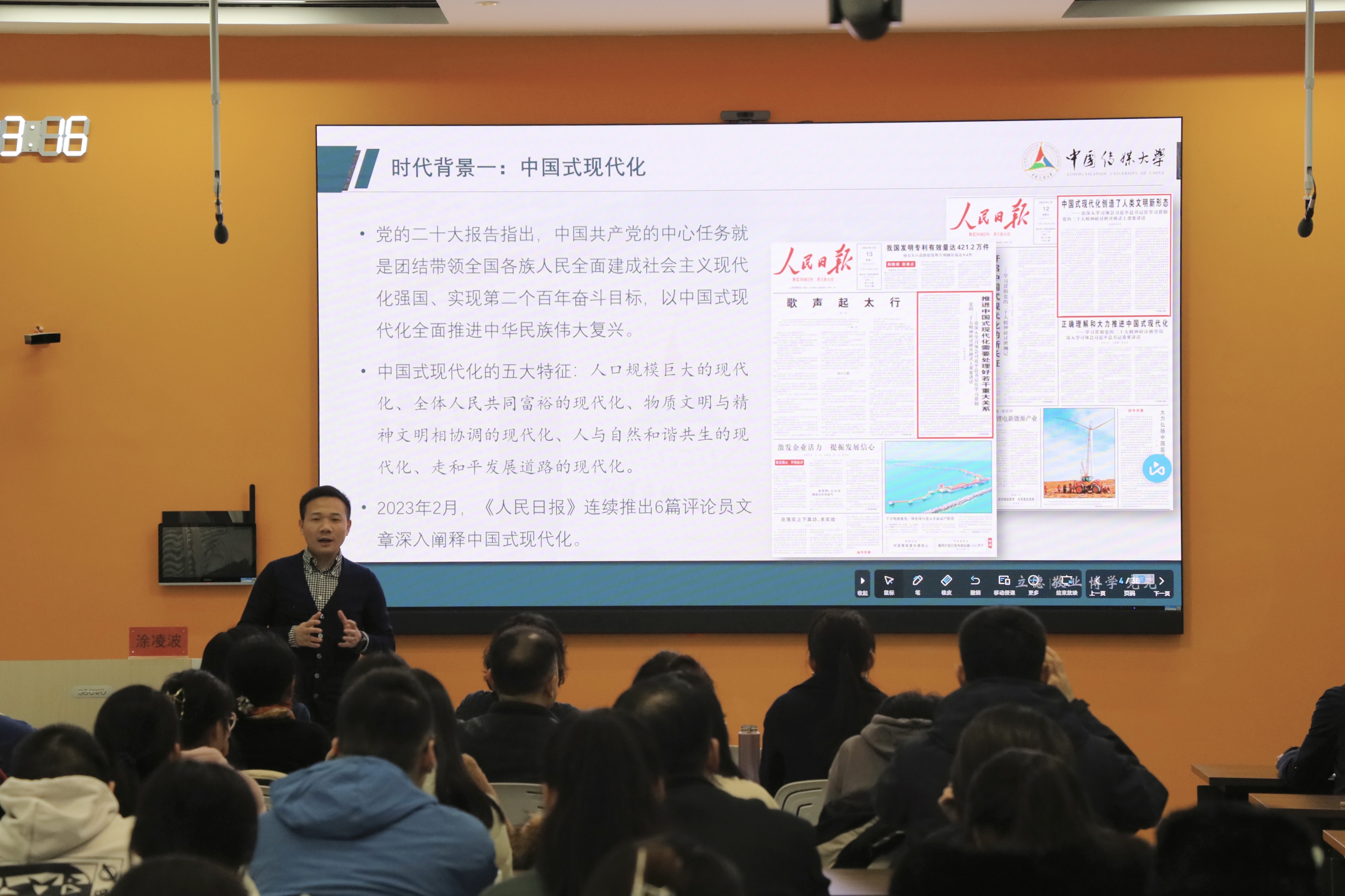 涂凌波以“中国式现代化与中国新闻学研究”为主题,围绕“中国式现代化与自主知识体系建设、中国新闻学研究的基本认识、中国新闻学研究的方法与路径思考”三方面展开讲座。首先,涂凌波由中国式现代化与建构中国自主的知识体系两个时代背景入题,阐释了二者颇具时代意义的紧密关系,并提出当下新闻学理论范式的发展应从“前职业化”到“职业化”再创新形成一种“社会化或关系化”的形态。接着,涂凌波在阐释了“当代中国新闻学”概念界定的基础上,就中西方新闻学研究如何破除“特殊与普遍”的二元对立困局,从中国哲学思辨的角度给出了回答。最后,涂凌波主张中国新闻学研究要“以中国为方法”,即主张扎根中国经验、寻求中国新闻理论研究的主体性。他指出,中国新闻学研究的思想根基是马克思主义中国化时代化,而研究的理论丰富来源则是纵深恒远的,我们既要从中华文明悠久源远的历史向度中寻求宝贵经验,也要着眼于当下中国式现代化的先进实践经验。