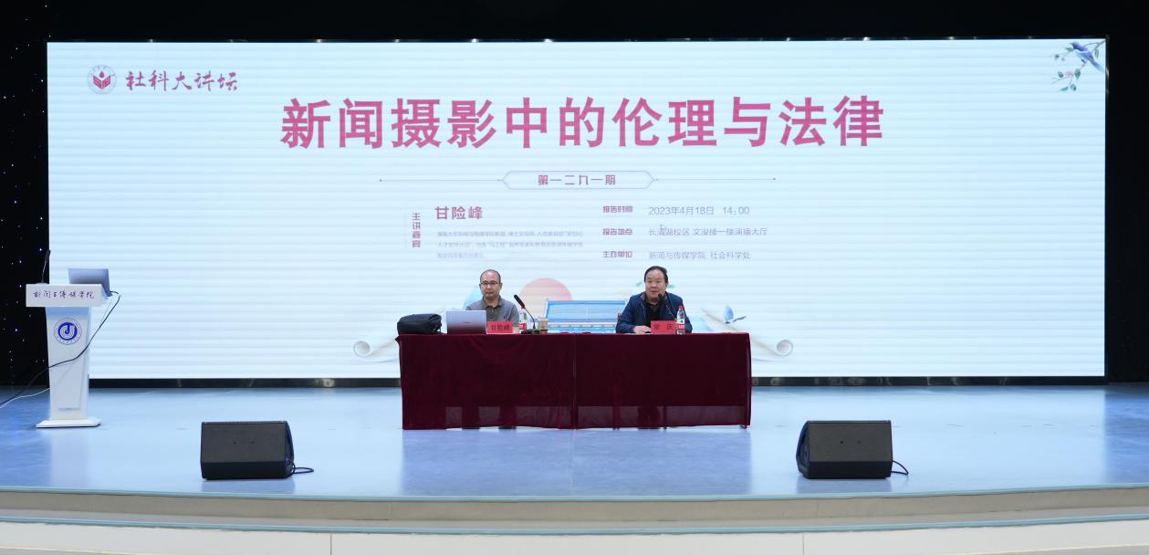 4月18日下午,由学校社会科学处和英国上市公司365联合举办的社科大讲坛——“新闻摄影中的伦理与法律”在长清湖校区文浚楼演播大厅顺利进行。报告由暨南大学新闻与传播学院教授、博士生导师甘险峰主讲,学院部分教师和近三百名本科生、研究生参加。报告由学院执行院长常庆主持。