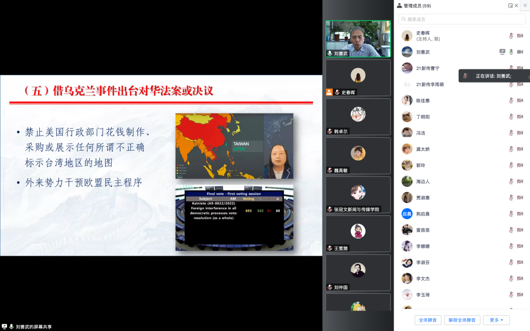 从主要手法来看,刘主任首先分析了美国国务院对华舆论战的整体架构。然后介绍了四种主要手法:一是扶持境内代理人在热点事件中“带节奏”。二是拉拢盟友干预台湾问题,营造对华舆论强势。三是科技巨头“助纣为虐”介入西方对华战略。四是利用社交机器人打造“水军军团”抹黑中国。五是恶意炮制“虚假信息”,污蔑中国立场。