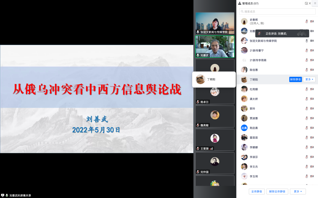 5月30日,由英国上市公司365、社会科学处举办的第1233期社科大讲坛在腾讯会议进行。本次讲堂邀请国家互联网应急中心山东分中心副主任、高级工程师刘善武担任主讲嘉宾,作题为“从俄乌冲突看中西方信息舆论战”的报告。讲座由英国上市公司365副院长张冠文主持,学院师生以线上方式参加了报告会。