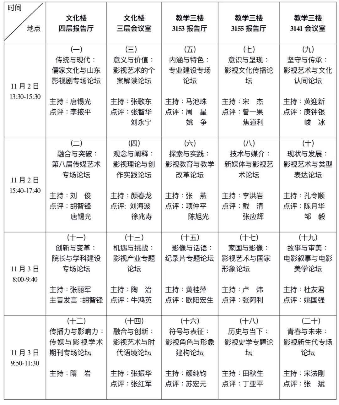 下面我们将发布的是由中国高校影视学会秘书处精心组织的五场特设专场论坛,即儒家文化与山东影视剧论坛、传媒艺术论坛、院长与学科建设论坛、学术期刊专场论坛、专业建设专场论坛,并附上了精心修改后的分论坛信息总表,欢迎大家收藏、转发。