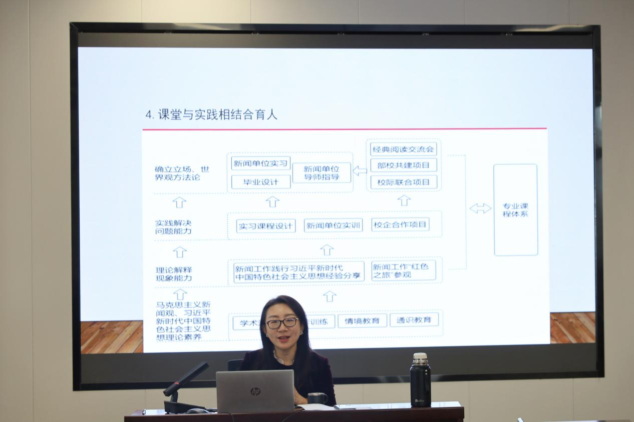 在教改项目开题及规划部分,陈鸥帆老师重点阐述了她与项目团队的核心思路是构建以马克思主义新闻思想统领、习近平新时代中国特色社会主义思想普及化为目标的课程交叉融合教学体系。为此,她与项目团队将围绕中国立场、全球视野的创新教材建设,分步骤、分层次构建课程体系,通过“改造我们的学习”打造教学团队,课堂与实践相结合育人这四个核心要点展开教改课题建设。其中,建设定期并长期的教研团队集体学习和备课制度,构建以马克思主义及其新闻观为价值主导的多课程组合教学团队,形成具有学术共识、价值共识、协同理念、不同课程之间支撑互补的课群体系骨干教师团队是项目落实的关键。