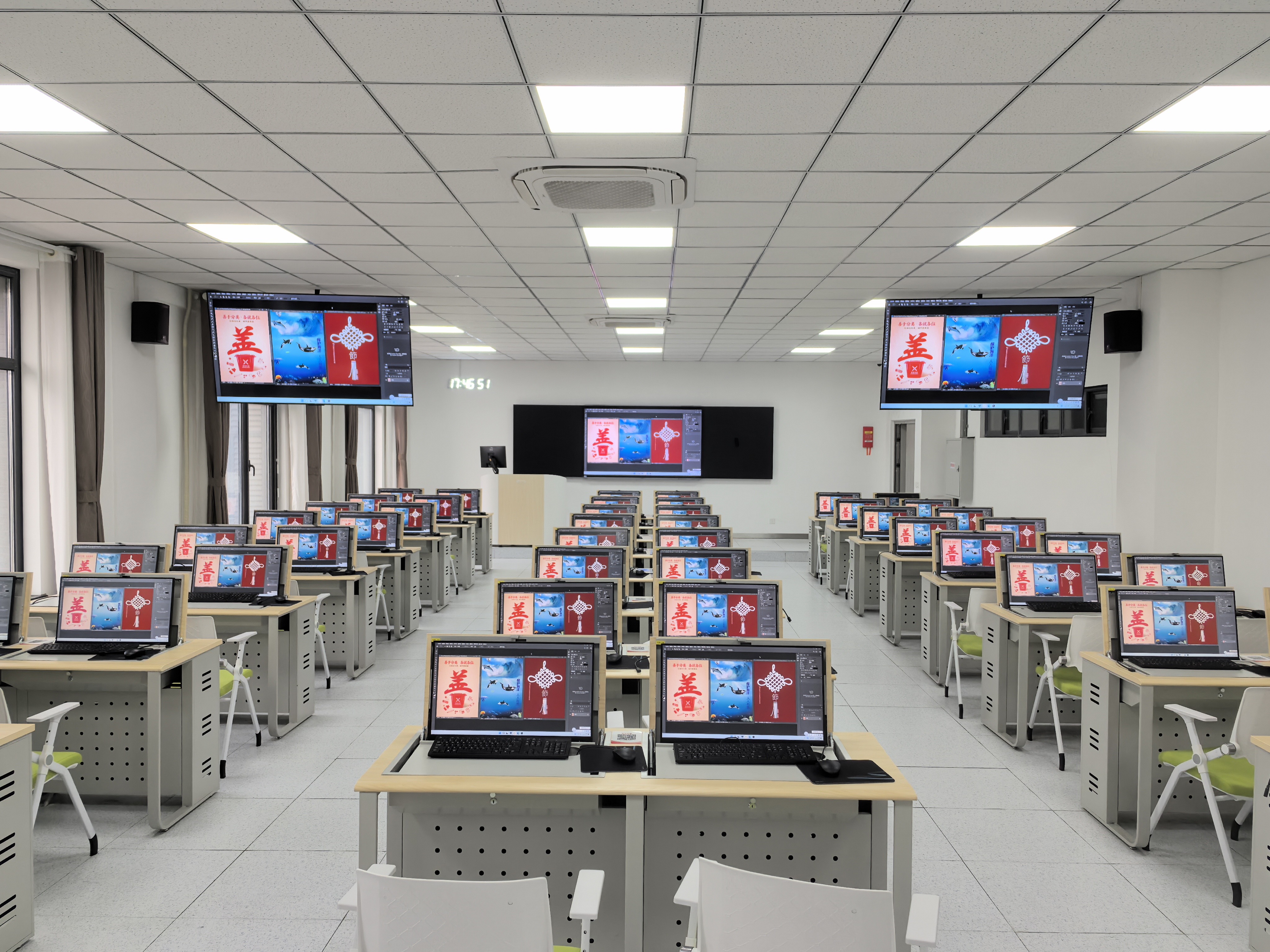 平面设计实验室面积为138平方米,设备总资产47万余元,由HP工作站、智慧黑板、智能讲台一体机、视频显示终端等54台(套)硬件设备组成,安装有Photoshop、ACDSee、Premiere、After Effect等专业设计处理软件。该实验室能满足《图像处理》《数字平面设计》《二维动画制作》《新媒体视觉设计基础》《网站规划与网页设计》《动画脚本与分镜头设计》等课程的实验教学需求。该实验室安装有先进的智慧机房管理系统,可实现一键开/关机、远程软件安装、屏幕广播、系统自动还原等功能。