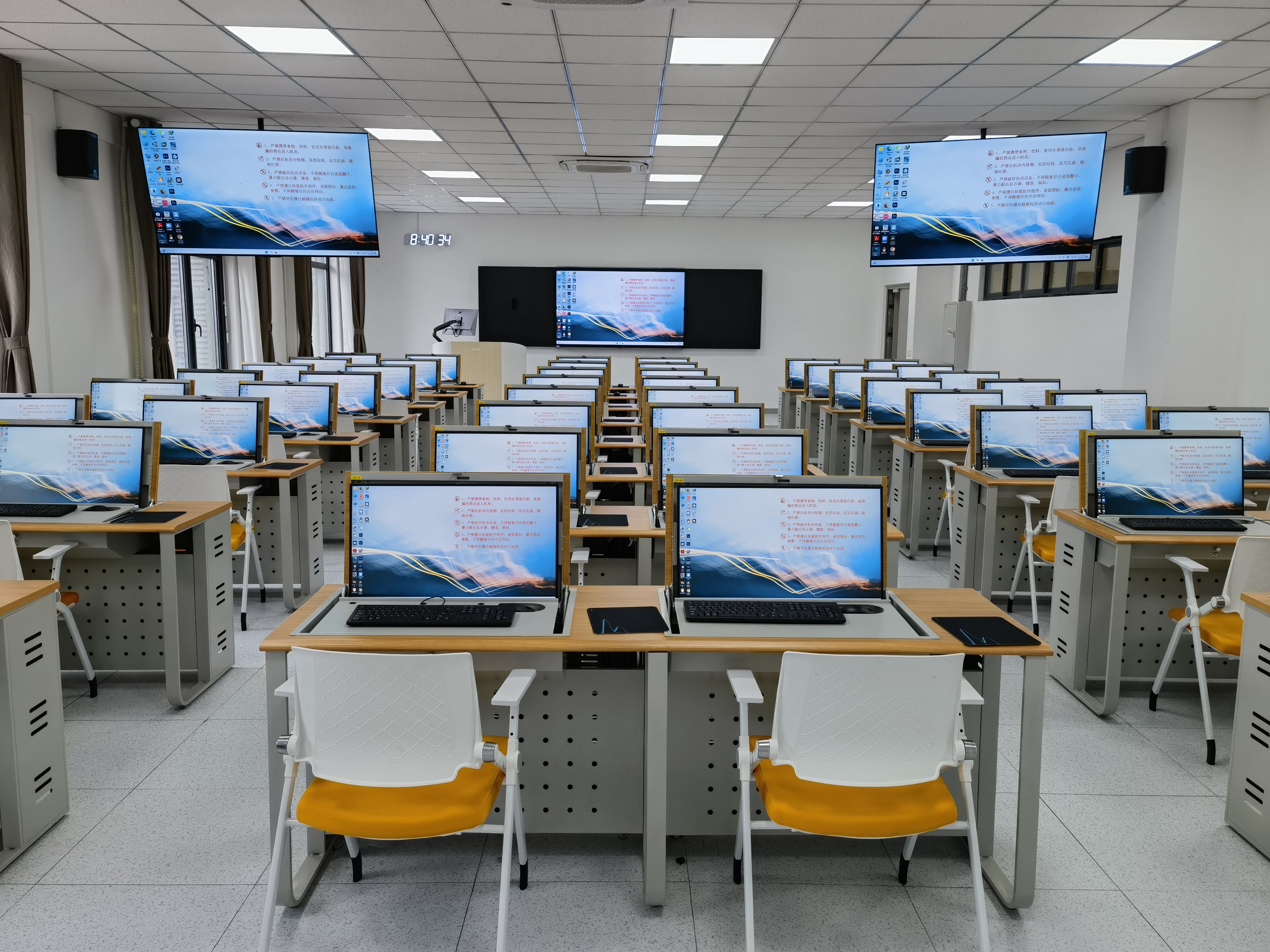 4K超高清编辑实验室面积为138平方米,设备总资产87万余元,由HP工作站、智慧黑板、智能讲台一体机、视频显示终端等54台(套)硬件设备组成,安装有Premiere、Audition、After Effect等专业视音频处理软件。该实验室能满足《新媒体编辑》《非线性编辑制作技术》《影视特技》《三维动画》《交互媒体创作》《纪录片与短视频创作》等课程的实验教学需求,完成4K超高清影视节目的制作与生产。该实验室安装有先进的智慧机房管理系统,可实现一键开/关机、远程软件安装、屏幕广播、系统自动还原等功能。