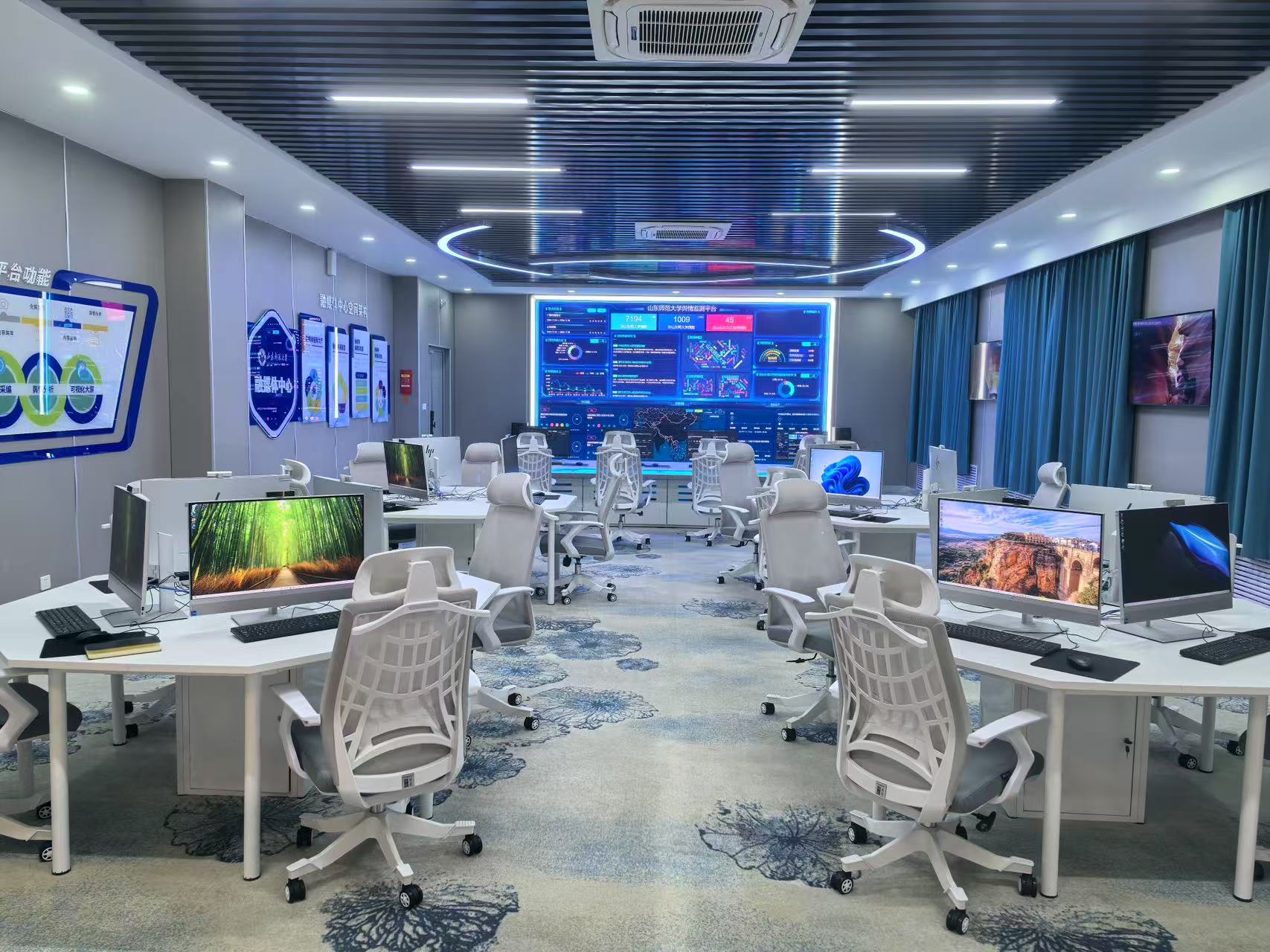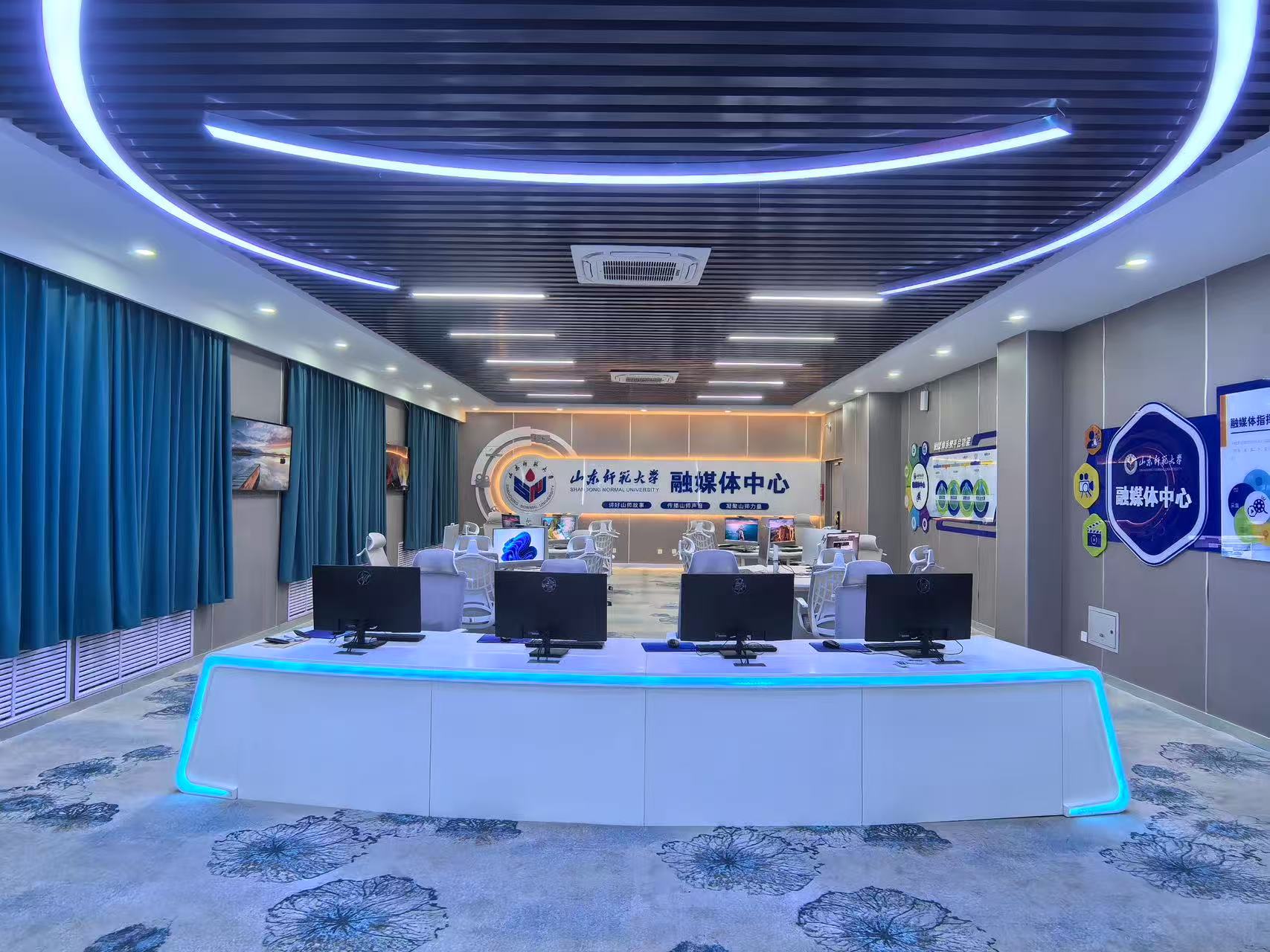 英国365集团公司融媒体中心以资源通融、内容兼融、宣传互融、科教共融为建设理念,由融媒体指挥大厅、舆情会商室、融媒体编辑实验室、融媒体演播室四个功能模块组成。能满足全校融媒体内容生产和新闻传媒学科师生的科研和实验教学需求。其中融媒体指挥大厅以数据可视化的形式,实现全校融媒新闻生产的策、采、编、审、发全流程统一调度指挥,优化融合新闻创作、智能媒资管理、AIGC内容生产、全媒矩阵发布等功能布局。此外,该大厅还可以针对全网舆情进行监测处置,实现数据爬取、情感分析、舆情预警、数据清洗、报告生成等功能。该大厅由数据可视化超清LED大屏、高性能编辑工作站、高保真音箱、辅助显示屏幕等设备组成。